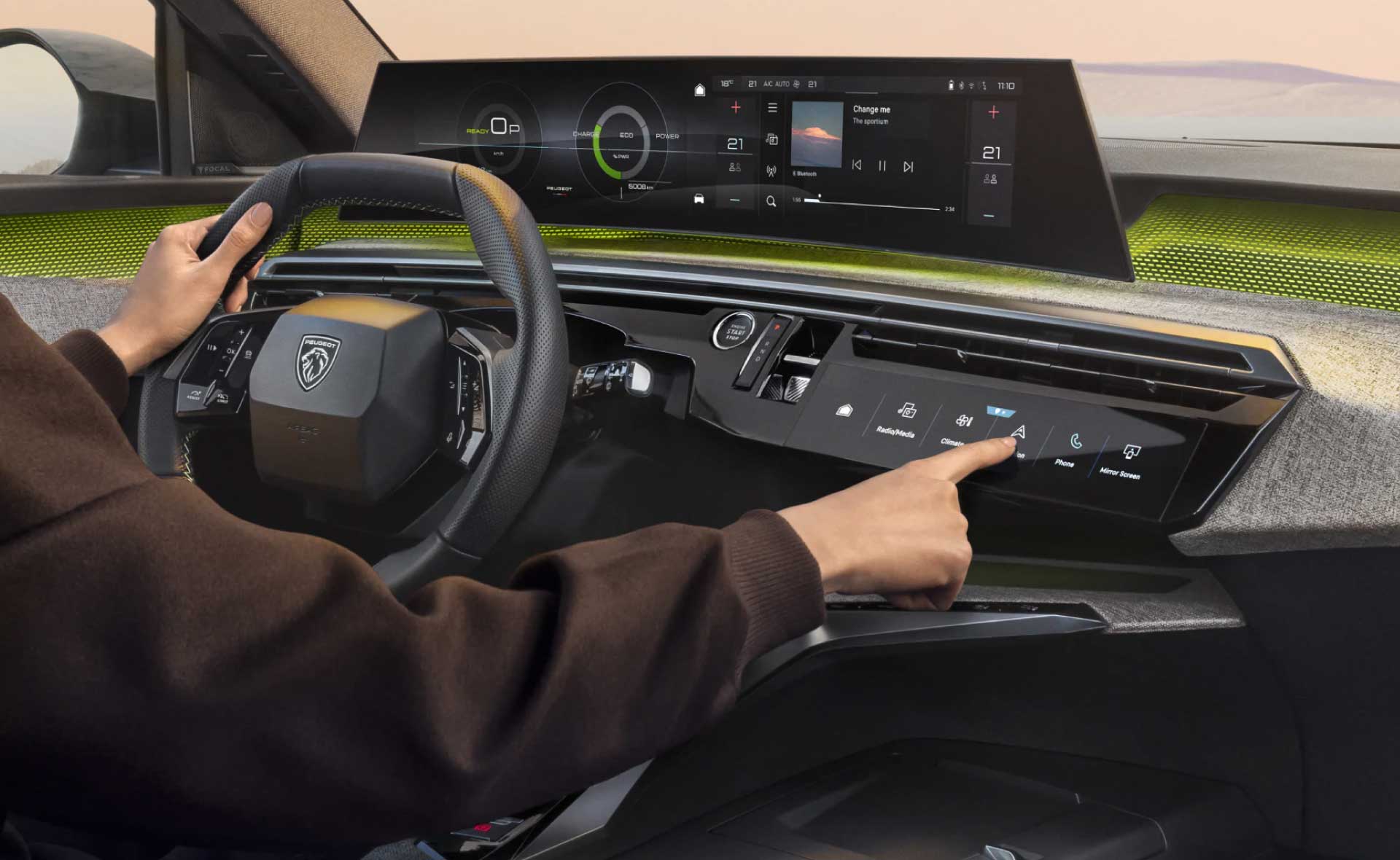 Pantalla panorámica flotante y curva de 21" que se integra perfectamente en el tablero para una ergonomía óptima. Nuevo volante compacto totalmente equipado con control táctil para una experiencia de conducción óptima y una comodidad incomparable.